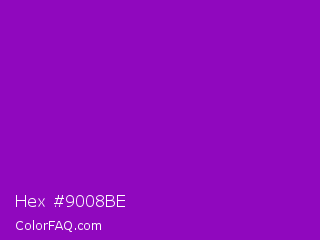 Hex #9008be Color is a normal purple color and the nearest color is French Violet #8806ce. Hex code #9008be and RGB value is rgb(144,8,190). In RGB color space, this color is composed of 56% red, 3% green, 75% blue, In CMYK color space, this color is composed of 24% cyan, 96% magenta, 0% yellow , 25% black , In HSL color space, this color has a hue angle of 285° , 92% saturation and 39% lightness.