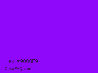 Hex #9008f9 Color is a normal purple color and the nearest color is Electric Violet #8f00ff. Hex code #9008f9 and RGB value is rgb(144,8,249). In RGB color space, this color is composed of 56% red, 3% green, 98% blue, In CMYK color space, this color is composed of 42% cyan, 97% magenta, 0% yellow , 2% black , In HSL color space, this color has a hue angle of 274° , 95% saturation and 50% lightness.