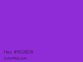 Hex #902bd8 Color is a normal purple color and the nearest color is Blue Violet #8a2be2. Hex code #902bd8 and RGB value is rgb(144,43,216). In RGB color space, this color is composed of 56% red, 17% green, 85% blue, In CMYK color space, this color is composed of 33% cyan, 80% magenta, 0% yellow , 15% black , In HSL color space, this color has a hue angle of 275° , 69% saturation and 51% lightness.