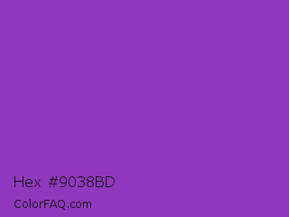 Hex #9038bd Color is a normal purple color and the nearest color is Dark Orchid #9932cc. Hex code #9038bd and RGB value is rgb(144,56,189). In RGB color space, this color is composed of 56% red, 22% green, 74% blue, In CMYK color space, this color is composed of 24% cyan, 70% magenta, 0% yellow , 26% black , In HSL color space, this color has a hue angle of 280° , 54% saturation and 48% lightness.