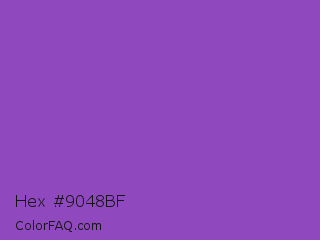 Hex #9048bf Color is a normal purple color and the nearest color is Deep Lilac #9955bb. Hex code #9048bf and RGB value is rgb(144,72,191). In RGB color space, this color is composed of 56% red, 28% green, 75% blue, In CMYK color space, this color is composed of 25% cyan, 62% magenta, 0% yellow , 25% black , In HSL color space, this color has a hue angle of 276° , 48% saturation and 52% lightness.