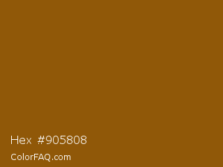 Hex #905808 Color is a dark orange color and the nearest color is Rusty Nail #86560a. Hex code #905808 and RGB value is rgb(144,88,8). In RGB color space, this color is composed of 56% red, 35% green, 3% blue, In CMYK color space, this color is composed of 0% cyan, 39% magenta, 94% yellow , 44% black , In HSL color space, this color has a hue angle of 35° , 89% saturation and 30% lightness.