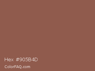 Hex #905b4d Color is a normal red color and the nearest color is Spicy Mix #8b5f4d. Hex code #905b4d and RGB value is rgb(144,91,77). In RGB color space, this color is composed of 56% red, 36% green, 30% blue, In CMYK color space, this color is composed of 0% cyan, 37% magenta, 47% yellow , 44% black , In HSL color space, this color has a hue angle of 13° , 30% saturation and 43% lightness.