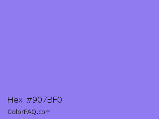 Hex #907bf0 Color is a light indigo color and the nearest color is Medium Purple #9370db. Hex code #907bf0 and RGB value is rgb(144,123,240). In RGB color space, this color is composed of 56% red, 48% green, 94% blue, In CMYK color space, this color is composed of 40% cyan, 49% magenta, 0% yellow , 6% black , In HSL color space, this color has a hue angle of 251° , 80% saturation and 71% lightness.