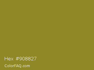 Hex #908827 Color is a normal yellow color and the nearest color is Hacienda #98811b. Hex code #908827 and RGB value is rgb(144,136,39). In RGB color space, this color is composed of 56% red, 53% green, 15% blue, In CMYK color space, this color is composed of 0% cyan, 6% magenta, 73% yellow , 44% black , In HSL color space, this color has a hue angle of 55° , 57% saturation and 36% lightness.