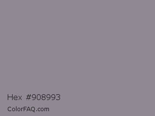 Hex #908993 Color is a normal purple color and the nearest color is Venus #928590. Hex code #908993 and RGB value is rgb(144,137,147). In RGB color space, this color is composed of 56% red, 54% green, 58% blue, In CMYK color space, this color is composed of 2% cyan, 7% magenta, 0% yellow , 42% black , In HSL color space, this color has a hue angle of 282° , 4% saturation and 56% lightness.