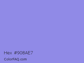Hex #908ae7 Color is a light indigo color and the nearest color is Chetwode Blue #8581d9. Hex code #908ae7 and RGB value is rgb(144,138,231). In RGB color space, this color is composed of 56% red, 54% green, 91% blue, In CMYK color space, this color is composed of 38% cyan, 40% magenta, 0% yellow , 9% black , In HSL color space, this color has a hue angle of 244° , 66% saturation and 72% lightness.