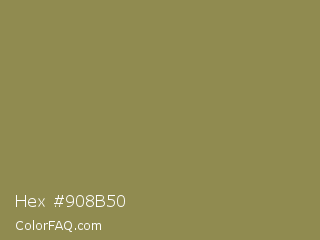 Hex #908b50 Color is a normal yellow color and the nearest color is Dark Tan #918151. Hex code #908b50 and RGB value is rgb(144,139,80). In RGB color space, this color is composed of 56% red, 55% green, 31% blue, In CMYK color space, this color is composed of 0% cyan, 3% magenta, 44% yellow , 44% black , In HSL color space, this color has a hue angle of 55° , 29% saturation and 44% lightness.