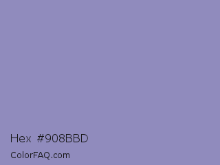 Hex #908bbd Color is a light indigo color and the nearest color is Lavender Purple #967bb6. Hex code #908bbd and RGB value is rgb(144,139,189). In RGB color space, this color is composed of 56% red, 55% green, 74% blue, In CMYK color space, this color is composed of 24% cyan, 26% magenta, 0% yellow , 26% black , In HSL color space, this color has a hue angle of 246° , 27% saturation and 64% lightness.