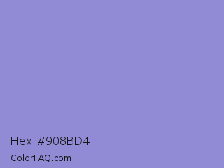 Hex #908bd4 Color is a light indigo color and the nearest color is Chetwode Blue #8581d9. Hex code #908bd4 and RGB value is rgb(144,139,212). In RGB color space, this color is composed of 56% red, 55% green, 83% blue, In CMYK color space, this color is composed of 32% cyan, 34% magenta, 0% yellow , 17% black , In HSL color space, this color has a hue angle of 244° , 46% saturation and 69% lightness.