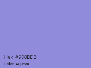 Hex #908bdb Color is a light indigo color and the nearest color is Chetwode Blue #8581d9. Hex code #908bdb and RGB value is rgb(144,139,219). In RGB color space, this color is composed of 56% red, 55% green, 86% blue, In CMYK color space, this color is composed of 34% cyan, 37% magenta, 0% yellow , 14% black , In HSL color space, this color has a hue angle of 244° , 53% saturation and 70% lightness.