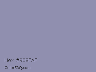 Hex #908faf Color is a light indigo color and the nearest color is Cool Grey #8c92ac. Hex code #908faf and RGB value is rgb(144,143,175). In RGB color space, this color is composed of 56% red, 56% green, 69% blue, In CMYK color space, this color is composed of 18% cyan, 18% magenta, 0% yellow , 31% black , In HSL color space, this color has a hue angle of 242° , 17% saturation and 62% lightness.