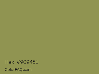 Hex #909451 Color is a normal yellow color and the nearest color is Moss Green #8a9a5b. Hex code #909451 and RGB value is rgb(144,148,81). In RGB color space, this color is composed of 56% red, 58% green, 32% blue, In CMYK color space, this color is composed of 3% cyan, 0% magenta, 45% yellow , 42% black , In HSL color space, this color has a hue angle of 64° , 29% saturation and 45% lightness.