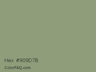 Hex #909d7b Color is a normal green color and the nearest color is Artichoke #8f9779. Hex code #909d7b and RGB value is rgb(144,157,123). In RGB color space, this color is composed of 56% red, 62% green, 48% blue, In CMYK color space, this color is composed of 8% cyan, 0% magenta, 22% yellow , 38% black , In HSL color space, this color has a hue angle of 83° , 15% saturation and 55% lightness.