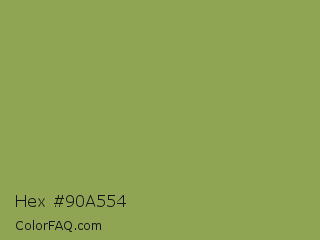 Hex #90a554 Color is a normal lime color and the nearest color is Moss Green #8a9a5b. Hex code #90a554 and RGB value is rgb(144,165,84). In RGB color space, this color is composed of 56% red, 65% green, 33% blue, In CMYK color space, this color is composed of 13% cyan, 0% magenta, 49% yellow , 35% black , In HSL color space, this color has a hue angle of 76° , 33% saturation and 49% lightness.