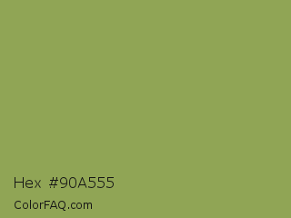 Hex #90a555 Color is a normal lime color and the nearest color is Moss Green #8a9a5b. Hex code #90a555 and RGB value is rgb(144,165,85). In RGB color space, this color is composed of 56% red, 65% green, 33% blue, In CMYK color space, this color is composed of 13% cyan, 0% magenta, 48% yellow , 35% black , In HSL color space, this color has a hue angle of 76° , 32% saturation and 49% lightness.