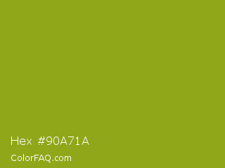 Hex #90a71a Color is a normal yellow color and the nearest color is Citron #9fa91f. Hex code #90a71a and RGB value is rgb(144,167,26). In RGB color space, this color is composed of 56% red, 65% green, 10% blue, In CMYK color space, this color is composed of 14% cyan, 0% magenta, 84% yellow , 35% black , In HSL color space, this color has a hue angle of 70° , 73% saturation and 38% lightness.