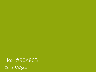 Hex #90a80b Color is a normal yellow color and the nearest color is Apple Green #8db600. Hex code #90a80b and RGB value is rgb(144,168,11). In RGB color space, this color is composed of 56% red, 66% green, 4% blue, In CMYK color space, this color is composed of 14% cyan, 0% magenta, 93% yellow , 34% black , In HSL color space, this color has a hue angle of 69° , 88% saturation and 35% lightness.