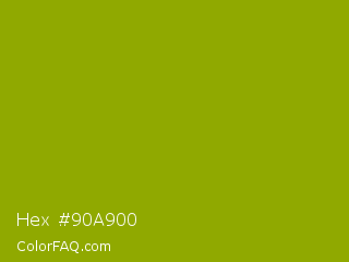 Hex #90a900 Color is a normal yellow color and the nearest color is Apple Green #8db600. Hex code #90a900 and RGB value is rgb(144,169,0). In RGB color space, this color is composed of 56% red, 66% green, 0% blue, In CMYK color space, this color is composed of 15% cyan, 0% magenta, 100% yellow , 34% black , In HSL color space, this color has a hue angle of 69° , 100% saturation and 33% lightness.