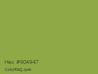 Hex #90a947 Color is a normal lime color and the nearest color is Sushi #87ab39. Hex code #90a947 and RGB value is rgb(144,169,71). In RGB color space, this color is composed of 56% red, 66% green, 28% blue, In CMYK color space, this color is composed of 15% cyan, 0% magenta, 58% yellow , 34% black , In HSL color space, this color has a hue angle of 75° , 41% saturation and 47% lightness.