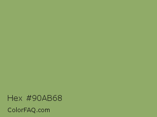 Hex #90ab68 Color is a normal green color and the nearest color is Asparagus #87a96b. Hex code #90ab68 and RGB value is rgb(144,171,104). In RGB color space, this color is composed of 56% red, 67% green, 41% blue, In CMYK color space, this color is composed of 16% cyan, 0% magenta, 39% yellow , 33% black , In HSL color space, this color has a hue angle of 84° , 29% saturation and 54% lightness.
