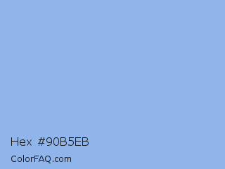Hex #90b5eb Color is a light blue color and the nearest color is Jordy Blue #8ab9f1. Hex code #90b5eb and RGB value is rgb(144,181,235). In RGB color space, this color is composed of 56% red, 71% green, 92% blue, In CMYK color space, this color is composed of 39% cyan, 23% magenta, 0% yellow , 8% black , In HSL color space, this color has a hue angle of 216° , 69% saturation and 74% lightness.