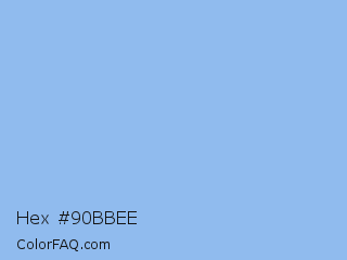 Hex #90bbee Color is a light blue color and the nearest color is Jordy Blue #8ab9f1. Hex code #90bbee and RGB value is rgb(144,187,238). In RGB color space, this color is composed of 56% red, 73% green, 93% blue, In CMYK color space, this color is composed of 39% cyan, 21% magenta, 0% yellow , 7% black , In HSL color space, this color has a hue angle of 213° , 73% saturation and 75% lightness.