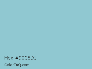 Hex #90c8d1 Color is a light cyan color and the nearest color is Dark Sky Blue #8cbed6. Hex code #90c8d1 and RGB value is rgb(144,200,209). In RGB color space, this color is composed of 56% red, 78% green, 82% blue, In CMYK color space, this color is composed of 31% cyan, 4% magenta, 0% yellow , 18% black , In HSL color space, this color has a hue angle of 188° , 41% saturation and 69% lightness.