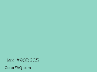 Hex #90d6c5 Color is a light cyan color and the nearest color is Middle Blue Green #8dd9cc. Hex code #90d6c5 and RGB value is rgb(144,214,197). In RGB color space, this color is composed of 56% red, 84% green, 77% blue, In CMYK color space, this color is composed of 33% cyan, 0% magenta, 8% yellow , 16% black , In HSL color space, this color has a hue angle of 165° , 46% saturation and 70% lightness.