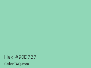 Hex #90d7b7 Color is a light green color and the nearest color is Vista Blue #8fd6b4. Hex code #90d7b7 and RGB value is rgb(144,215,183). In RGB color space, this color is composed of 56% red, 84% green, 72% blue, In CMYK color space, this color is composed of 33% cyan, 0% magenta, 15% yellow , 16% black , In HSL color space, this color has a hue angle of 153° , 47% saturation and 70% lightness.