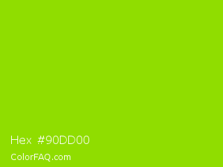 Hex #90dd00 Color is a normal green color and the nearest color is Sheen Green #8fd400. Hex code #90dd00 and RGB value is rgb(144,221,0). In RGB color space, this color is composed of 56% red, 87% green, 0% blue, In CMYK color space, this color is composed of 35% cyan, 0% magenta, 100% yellow , 13% black , In HSL color space, this color has a hue angle of 81° , 100% saturation and 43% lightness.
