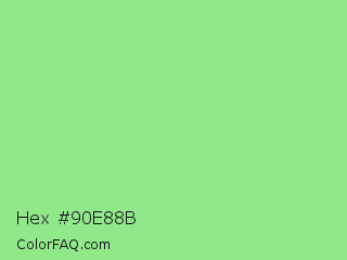 Hex #90e88b Color is a light green color and the nearest color is Light Green #90ee90. Hex code #90e88b and RGB value is rgb(144,232,139). In RGB color space, this color is composed of 56% red, 91% green, 55% blue, In CMYK color space, this color is composed of 38% cyan, 0% magenta, 40% yellow , 9% black , In HSL color space, this color has a hue angle of 117° , 67% saturation and 73% lightness.