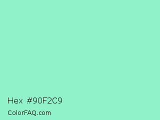 Hex #90f2c9 Color is a light green color and the nearest color is Riptide #8be6d8. Hex code #90f2c9 and RGB value is rgb(144,242,201). In RGB color space, this color is composed of 56% red, 95% green, 79% blue, In CMYK color space, this color is composed of 40% cyan, 0% magenta, 17% yellow , 5% black , In HSL color space, this color has a hue angle of 155° , 79% saturation and 76% lightness.