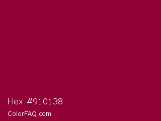 Hex #910138 Color is a dark rose color and the nearest color is Pink Raspberry #980036. Hex code #910138 and RGB value is rgb(145,1,56). In RGB color space, this color is composed of 57% red, 0% green, 22% blue, In CMYK color space, this color is composed of 0% cyan, 99% magenta, 61% yellow , 43% black , In HSL color space, this color has a hue angle of 337° , 99% saturation and 29% lightness.