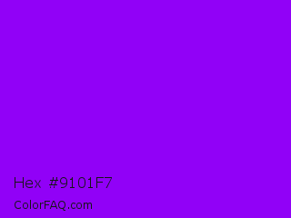 Hex #9101f7 Color is a normal purple color and the nearest color is Electric Violet #8f00ff. Hex code #9101f7 and RGB value is rgb(145,1,247). In RGB color space, this color is composed of 57% red, 0% green, 97% blue, In CMYK color space, this color is composed of 41% cyan, 100% magenta, 0% yellow , 3% black , In HSL color space, this color has a hue angle of 275° , 99% saturation and 49% lightness.