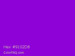 Hex #9102d8 Color is a normal purple color and the nearest color is Dark Violet #9400d3. Hex code #9102d8 and RGB value is rgb(145,2,216). In RGB color space, this color is composed of 57% red, 1% green, 85% blue, In CMYK color space, this color is composed of 33% cyan, 99% magenta, 0% yellow , 15% black , In HSL color space, this color has a hue angle of 280° , 98% saturation and 43% lightness.