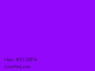 Hex #9108fa Color is a normal purple color and the nearest color is Electric Violet #8f00ff. Hex code #9108fa and RGB value is rgb(145,8,250). In RGB color space, this color is composed of 57% red, 3% green, 98% blue, In CMYK color space, this color is composed of 42% cyan, 97% magenta, 0% yellow , 2% black , In HSL color space, this color has a hue angle of 274° , 96% saturation and 51% lightness.