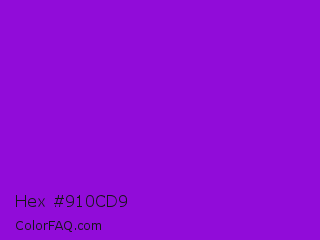 Hex #910cd9 Color is a normal purple color and the nearest color is Dark Violet #9400d3. Hex code #910cd9 and RGB value is rgb(145,12,217). In RGB color space, this color is composed of 57% red, 5% green, 85% blue, In CMYK color space, this color is composed of 33% cyan, 94% magenta, 0% yellow , 15% black , In HSL color space, this color has a hue angle of 279° , 90% saturation and 45% lightness.