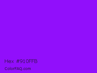 Hex #910ffb Color is a normal purple color and the nearest color is Electric Violet #8f00ff. Hex code #910ffb and RGB value is rgb(145,15,251). In RGB color space, this color is composed of 57% red, 6% green, 98% blue, In CMYK color space, this color is composed of 42% cyan, 94% magenta, 0% yellow , 2% black , In HSL color space, this color has a hue angle of 273° , 97% saturation and 52% lightness.
