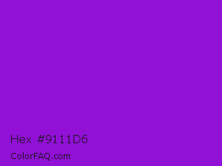 Hex #9111d6 Color is a normal purple color and the nearest color is French Violet #8806ce. Hex code #9111d6 and RGB value is rgb(145,17,214). In RGB color space, this color is composed of 57% red, 7% green, 84% blue, In CMYK color space, this color is composed of 32% cyan, 92% magenta, 0% yellow , 16% black , In HSL color space, this color has a hue angle of 279° , 85% saturation and 45% lightness.