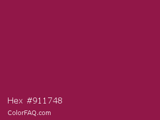 Hex #911748 Color is a normal rose color and the nearest color is Disco #871550. Hex code #911748 and RGB value is rgb(145,23,72). In RGB color space, this color is composed of 57% red, 9% green, 28% blue, In CMYK color space, this color is composed of 0% cyan, 84% magenta, 50% yellow , 43% black , In HSL color space, this color has a hue angle of 336° , 73% saturation and 33% lightness.