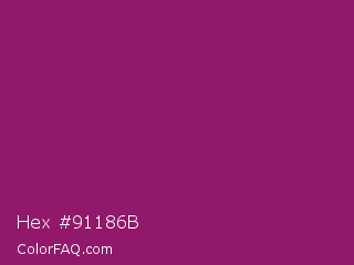 Hex #91186b Color is a normal magenta color and the nearest color is Cardinal Pink #8c055e. Hex code #91186b and RGB value is rgb(145,24,107). In RGB color space, this color is composed of 57% red, 9% green, 42% blue, In CMYK color space, this color is composed of 0% cyan, 83% magenta, 26% yellow , 43% black , In HSL color space, this color has a hue angle of 319° , 72% saturation and 33% lightness.