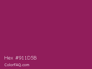 Hex #911d5b Color is a normal rose color and the nearest color is Dark Raspberry #872657. Hex code #911d5b and RGB value is rgb(145,29,91). In RGB color space, this color is composed of 57% red, 11% green, 36% blue, In CMYK color space, this color is composed of 0% cyan, 80% magenta, 37% yellow , 43% black , In HSL color space, this color has a hue angle of 328° , 67% saturation and 34% lightness.
