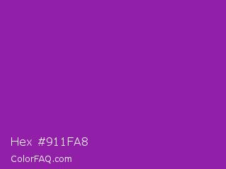 Hex #911fa8 Color is a normal purple color and the nearest color is Violet Eggplant #991199. Hex code #911fa8 and RGB value is rgb(145,31,168). In RGB color space, this color is composed of 57% red, 12% green, 66% blue, In CMYK color space, this color is composed of 14% cyan, 82% magenta, 0% yellow , 34% black , In HSL color space, this color has a hue angle of 290° , 69% saturation and 39% lightness.