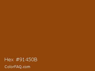 Hex #91450b Color is a normal orange color and the nearest color is Korma #8f4b0e. Hex code #91450b and RGB value is rgb(145,69,11). In RGB color space, this color is composed of 57% red, 27% green, 4% blue, In CMYK color space, this color is composed of 0% cyan, 52% magenta, 92% yellow , 43% black , In HSL color space, this color has a hue angle of 26° , 86% saturation and 31% lightness.