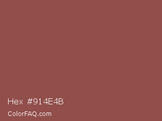Hex #914e4b Color is a normal red color and the nearest color is Copper Rust #944747. Hex code #914e4b and RGB value is rgb(145,78,75). In RGB color space, this color is composed of 57% red, 31% green, 29% blue, In CMYK color space, this color is composed of 0% cyan, 46% magenta, 48% yellow , 43% black , In HSL color space, this color has a hue angle of 3° , 32% saturation and 43% lightness.
