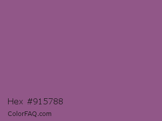 Hex #915788 Color is a normal magenta color and the nearest color is Antique Fuchsia #915c83. Hex code #915788 and RGB value is rgb(145,87,136). In RGB color space, this color is composed of 57% red, 34% green, 53% blue, In CMYK color space, this color is composed of 0% cyan, 40% magenta, 6% yellow , 43% black , In HSL color space, this color has a hue angle of 309° , 25% saturation and 45% lightness.