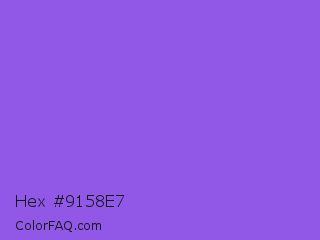 Hex #9158e7 Color is a light violet color and the nearest color is Navy Purple #9457eb. Hex code #9158e7 and RGB value is rgb(145,88,231). In RGB color space, this color is composed of 57% red, 35% green, 91% blue, In CMYK color space, this color is composed of 37% cyan, 62% magenta, 0% yellow , 9% black , In HSL color space, this color has a hue angle of 264° , 75% saturation and 63% lightness.