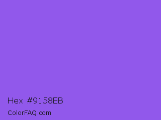 Hex #9158eb Color is a light violet color and the nearest color is Navy Purple #9457eb. Hex code #9158eb and RGB value is rgb(145,88,235). In RGB color space, this color is composed of 57% red, 35% green, 92% blue, In CMYK color space, this color is composed of 38% cyan, 63% magenta, 0% yellow , 8% black , In HSL color space, this color has a hue angle of 263° , 79% saturation and 63% lightness.