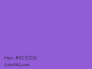Hex #915cd6 Color is a normal violet color and the nearest color is Amethyst #9966cc. Hex code #915cd6 and RGB value is rgb(145,92,214). In RGB color space, this color is composed of 57% red, 36% green, 84% blue, In CMYK color space, this color is composed of 32% cyan, 57% magenta, 0% yellow , 16% black , In HSL color space, this color has a hue angle of 266° , 60% saturation and 60% lightness.